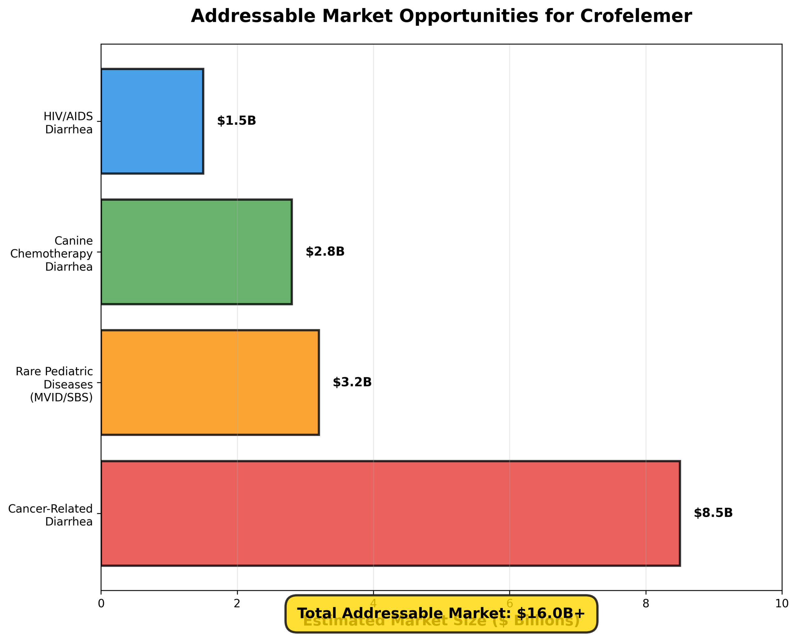 The oncology supportive care market represents Jaguar’s largest opportunity. Cancer therapy-related diarrhea affects millions of patients annually, particularly those receiving targeted therapies and chemotherapy. The market for CTD treatments is estimated to exceed $8 billion globally, with limited effective treatment options currently available.