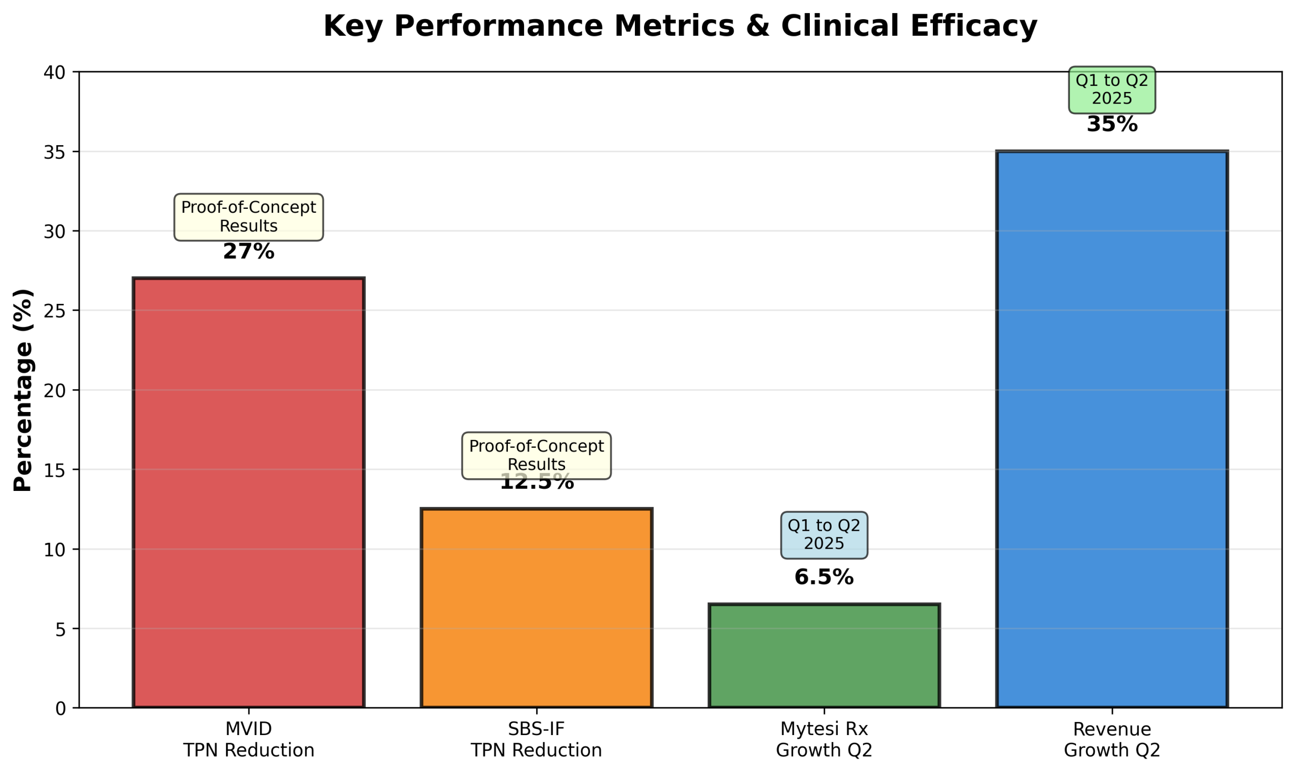 MVID Breakthrough: Initial results from the investigator-initiated trial in Abu Dhabi demonstrated up to 27% reduction in total parenteral nutrition requirements—a clinically meaningful improvement for patients dependent on IV feeding. This data supports potential Breakthrough Therapy designation from the FDA and inclusion in the EMA’s PRIME program for expedited regulatory approval.